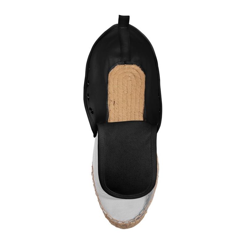 There is a seam down the back of the high top espadrilles, which has a heel loop at the top to aid in putting your ankle shoes on. The laces are threaded through four pairs of metal eyelets, which span two and a half inches up shoe's side panels. The top of the arched tongue sits around two inches above the top of the lace (on a straight lace-up, other lacing styles may vary)