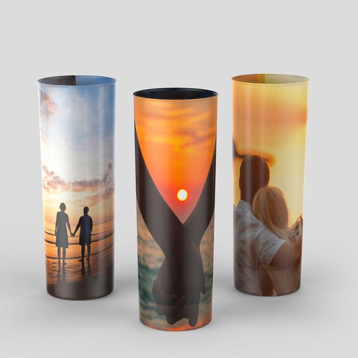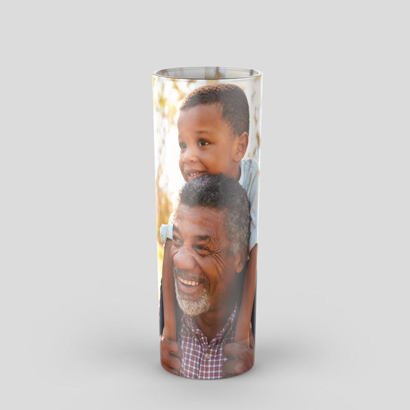 This glass is great for simple cocktails like a vodka soda (with lime, of course) or an elaborate Mojito. Your photo will look detailed and mostly opaque, but you should still be able to see how much drink is left in your glass through the print. The matte and glossy finishes will have the colours looking equally bright, so choose the finish that you like the best for your photo gifts.