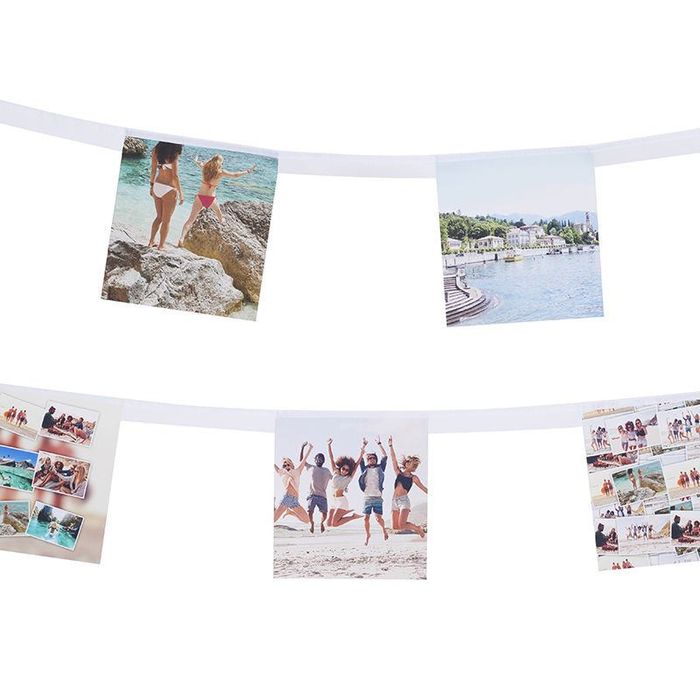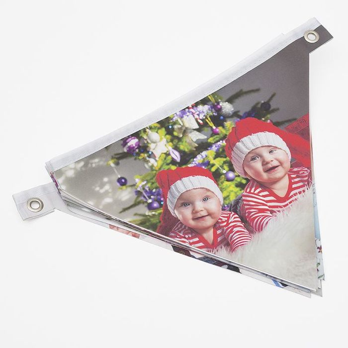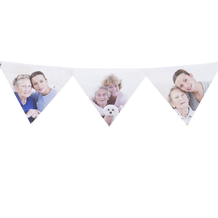 Your designs and photos are printed onto the strong bunting fabric using eco-friendly inks. The inks penetrate the fibres of the fabric creating a strong and permanent bond which will not fade away. Each printed flag is then cut to size and stitched onto the bunting string. Eyelets are added for easy hanging and then sent straight to you.