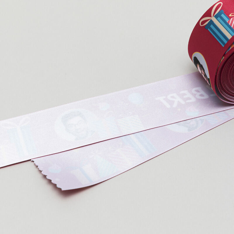 We are one of the few who can make photo ribbon in full colour with your photos printed in long strips. Add several photos and text to make an impressive photo ribbon for any occasion. Be sure to select the wider ribbons for photo printing, so at least 50 or 70 mm so the photo content is big enough to be visible.