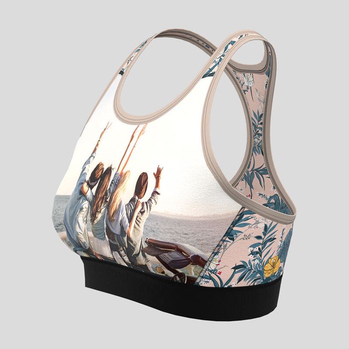 With up to eight areas to customise, there’s plenty of room for creativity. Upload patterns, photos or typography to the design interface to personalise the front, back, both side panels, both shoulder straps and the front and back of the elastic band. Your print is mirrored on the inside of the bra, except for the elastic band. If you’re adding a name, keep text at least 1 cm from the edges so it remains visible. Landscape images suit the front panel best; the rest are ideal for solid colours or repeat prints. The seven binding colours let you match or contrast your artwork, while black or white stitching gives the final professional touch.