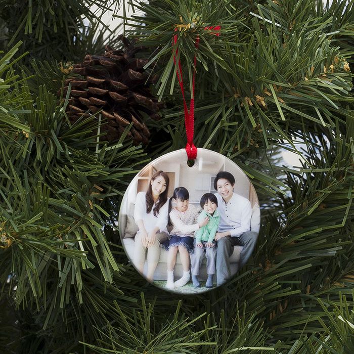 Your ornaments are handmade. Our printed ceramic ornaments have fantastic high-quality print over the surface of the personalised Christmas photo ornament that you design. These personalised Christmas decorations are ceramic discs, quite thick, and a little heavier than personalised Christmas baubles. We use a 3D digital printing