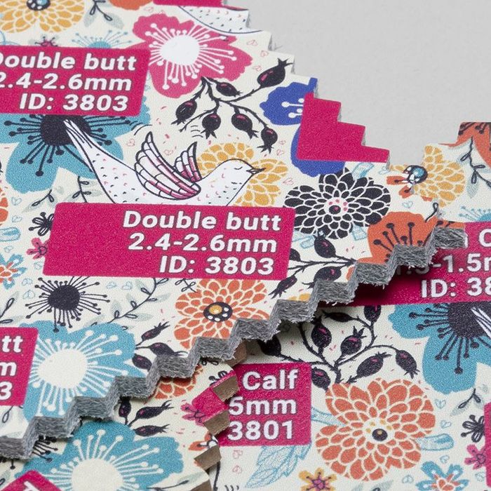 We print a standard design onto each of the leathers that we offer. This design will portray both fine detailing as well as solid blocks of colour. The colours are rich and vibrant, with a combination of dark and bright, giving you as much variety as we can within the design.